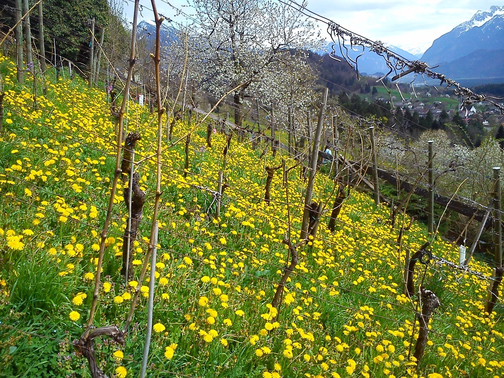 Trotz der wunderschönen Frühlingstimmung, der leuchtenden Löwenzahnblüten und den Blick auf die verschneiten Berge vor einem strahlden blauen Himmel, lassen sich die Knospen der Reben noch viel Zeit.